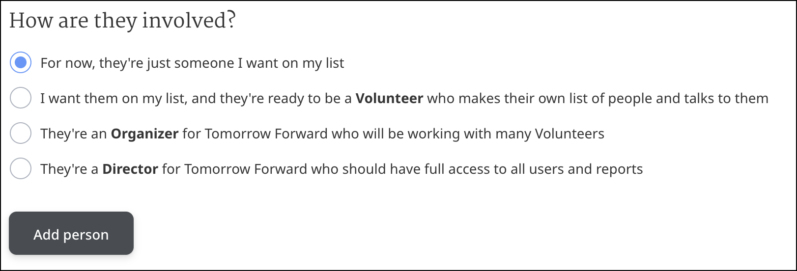 Under the How are they involved?, you can set the role and permissions for this new person. Since you are adding a contact, you will want to select the option: For now, they're just someone on my list.