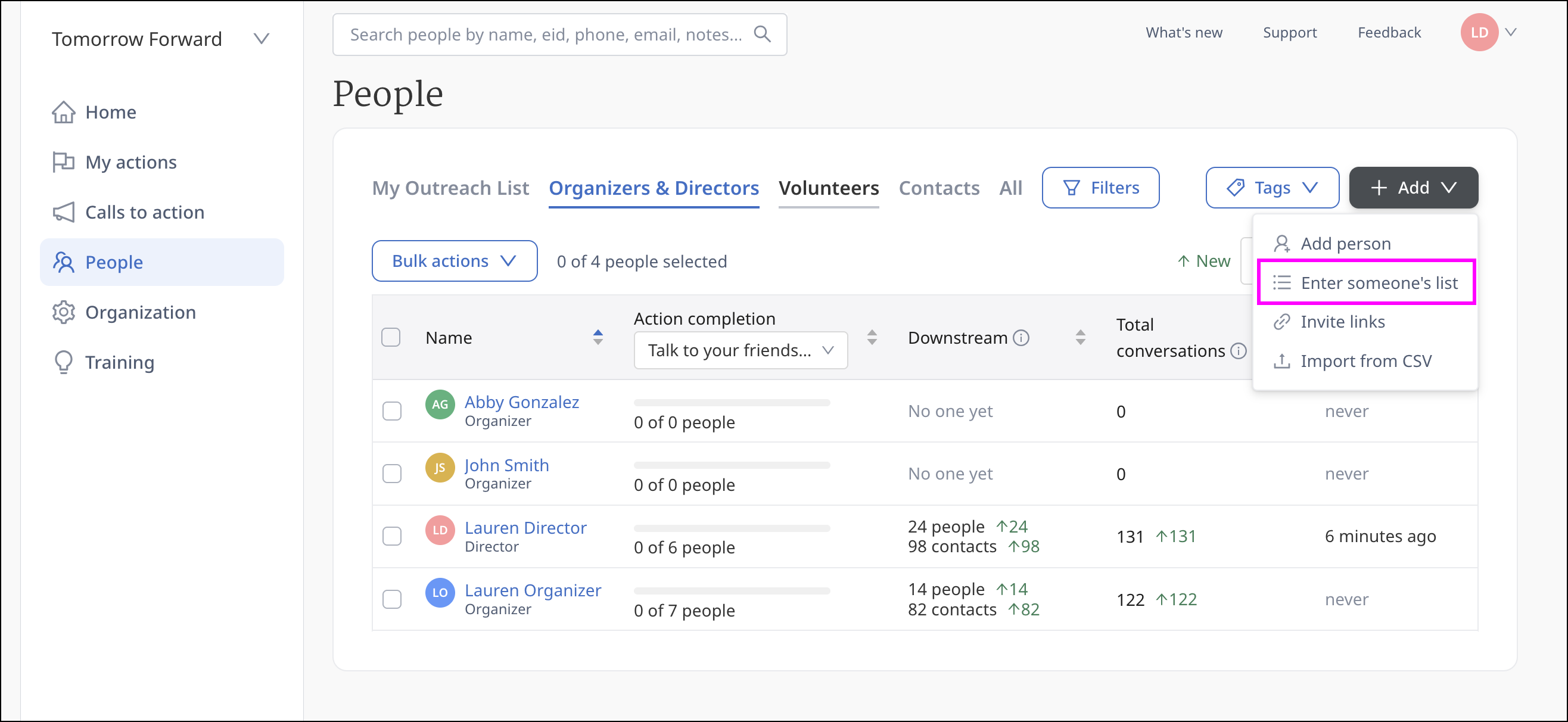 Directors can also enter a volunteers list by going to People and clicking Add and then Enter Someone's List. Organizers can find this on their home page under Add People. Select the volunteer whose list you want to enter from the dropdown.