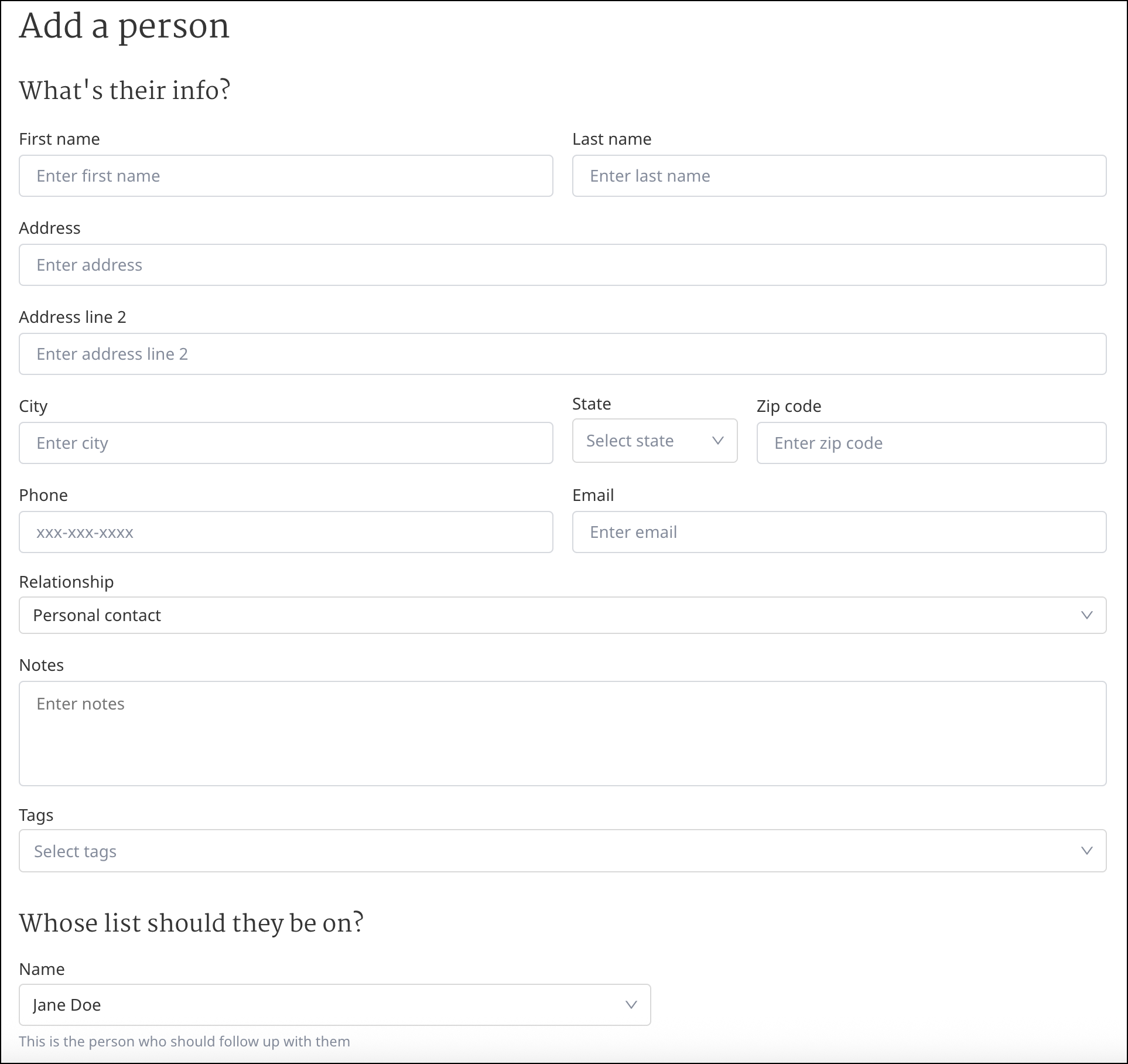 Every contact that you add to the Empower tool must be on a list. Under the question Whose list should they be on?, you can assign your new contact to an Organizer, Director, or Volunteer’s list. You can assign this new contact to the person’s list who will be following up and interacting with them. You can assign the contacts to yourself.