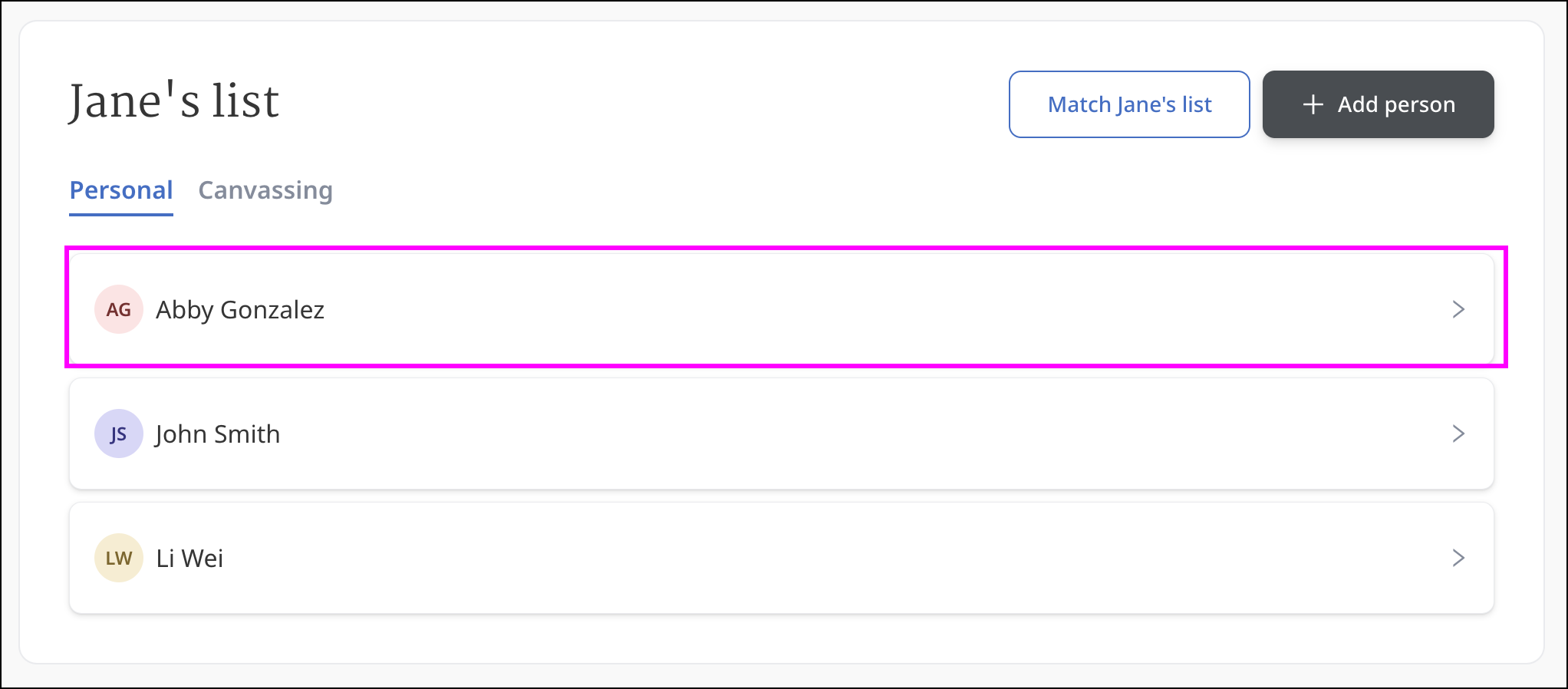 The person that you want to promote is currently on the list of an existing volunteer. Click on the name of the existing volunteer whose list includes the person that you want to promote to become a new volunteer.