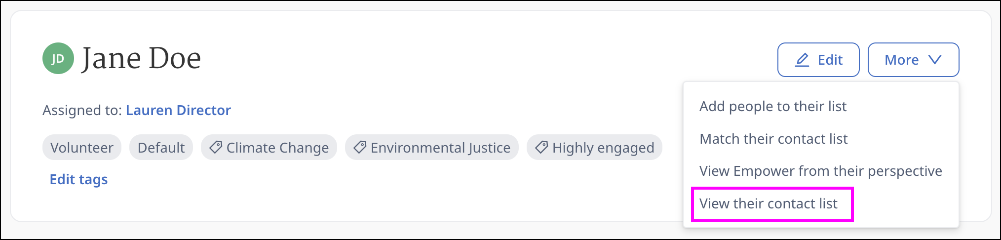 You are now on the existing volunteer’s page. To find and promote the person that you are looking for, click on the More button. Then click on the View their contact list button.