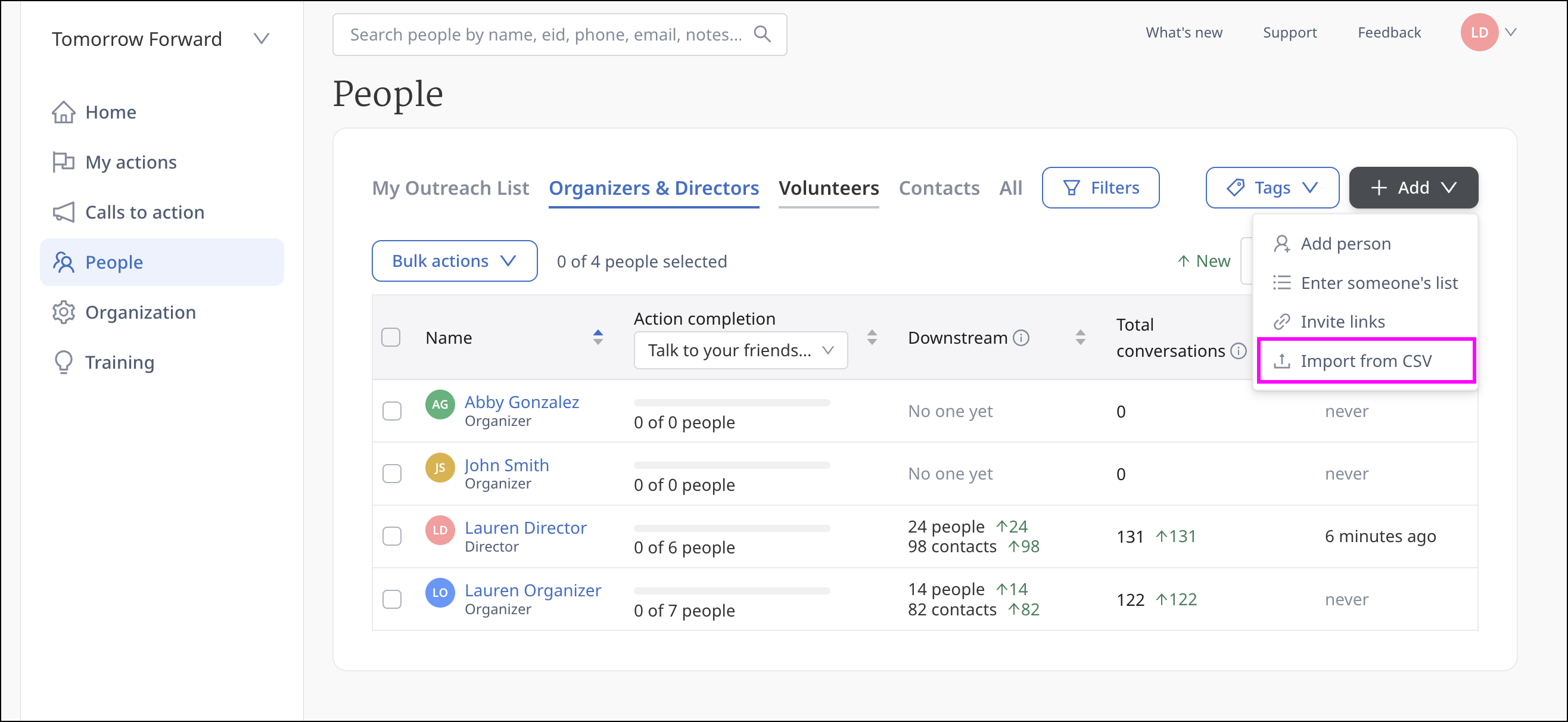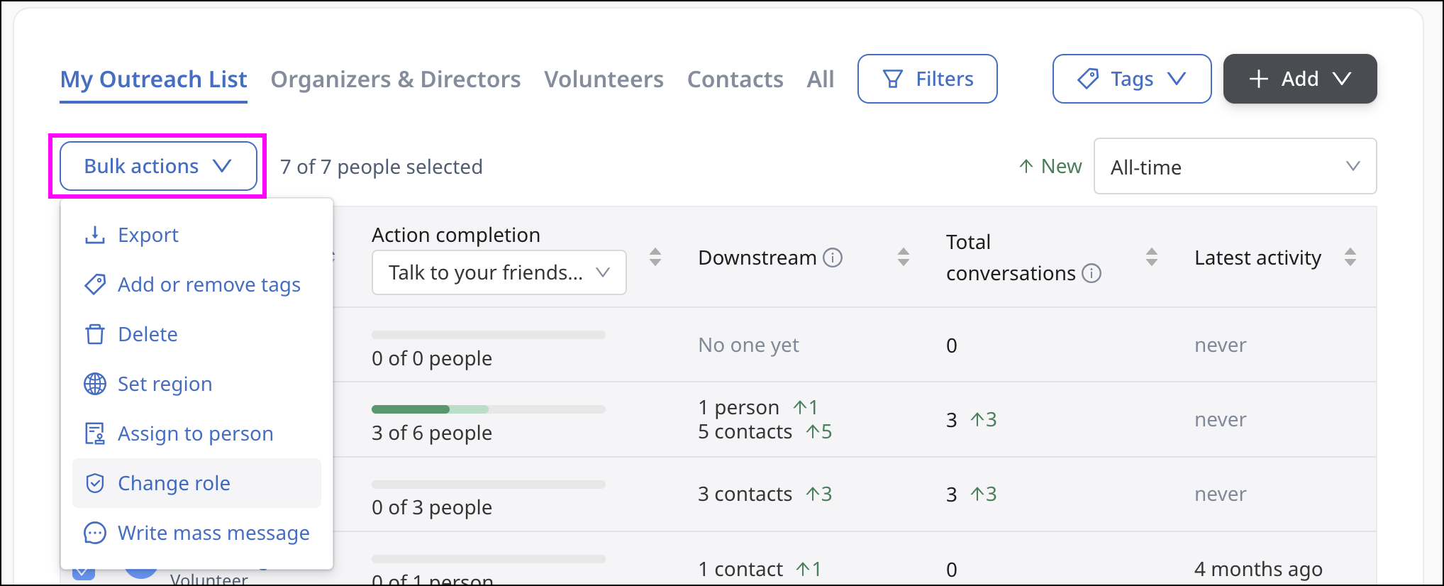 You can also bulk promote multiple contacts to volunteers at once. Click on the People tab and select all of the contacts that you would like to promote to volunteer. Check out this article on Bulk Actions to get a step-by-step guide on how to bulk promote.