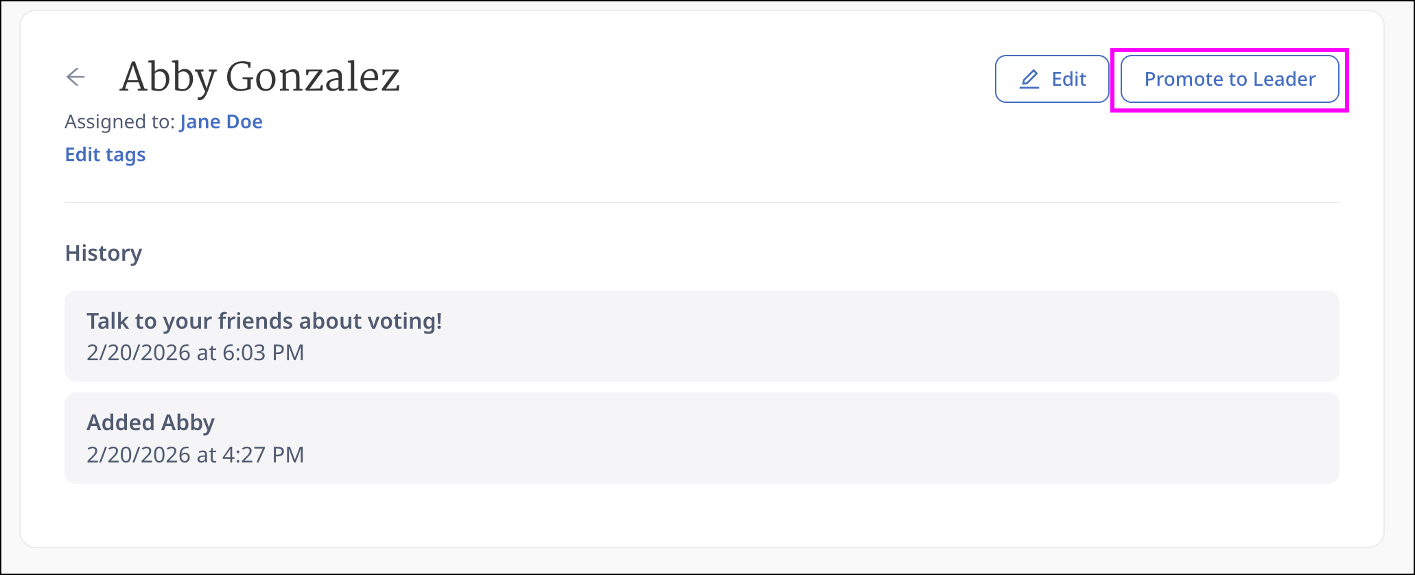 After clicking on the arrow, you can see a Promote to Leader button on the top right hand side of the screen. Click on that button to promote this person to a volunteer.