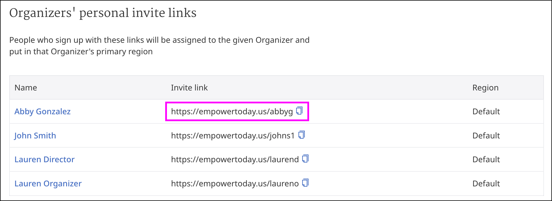 You will next see a list of Organizers and Directors associated with your campaign. Select either the Organizer or Director that you would like to assign these new volunteers to and copy their invite links. We recommend assigning the new Volunteer to the Organizer or Director that will be leading outreach and communications to them.