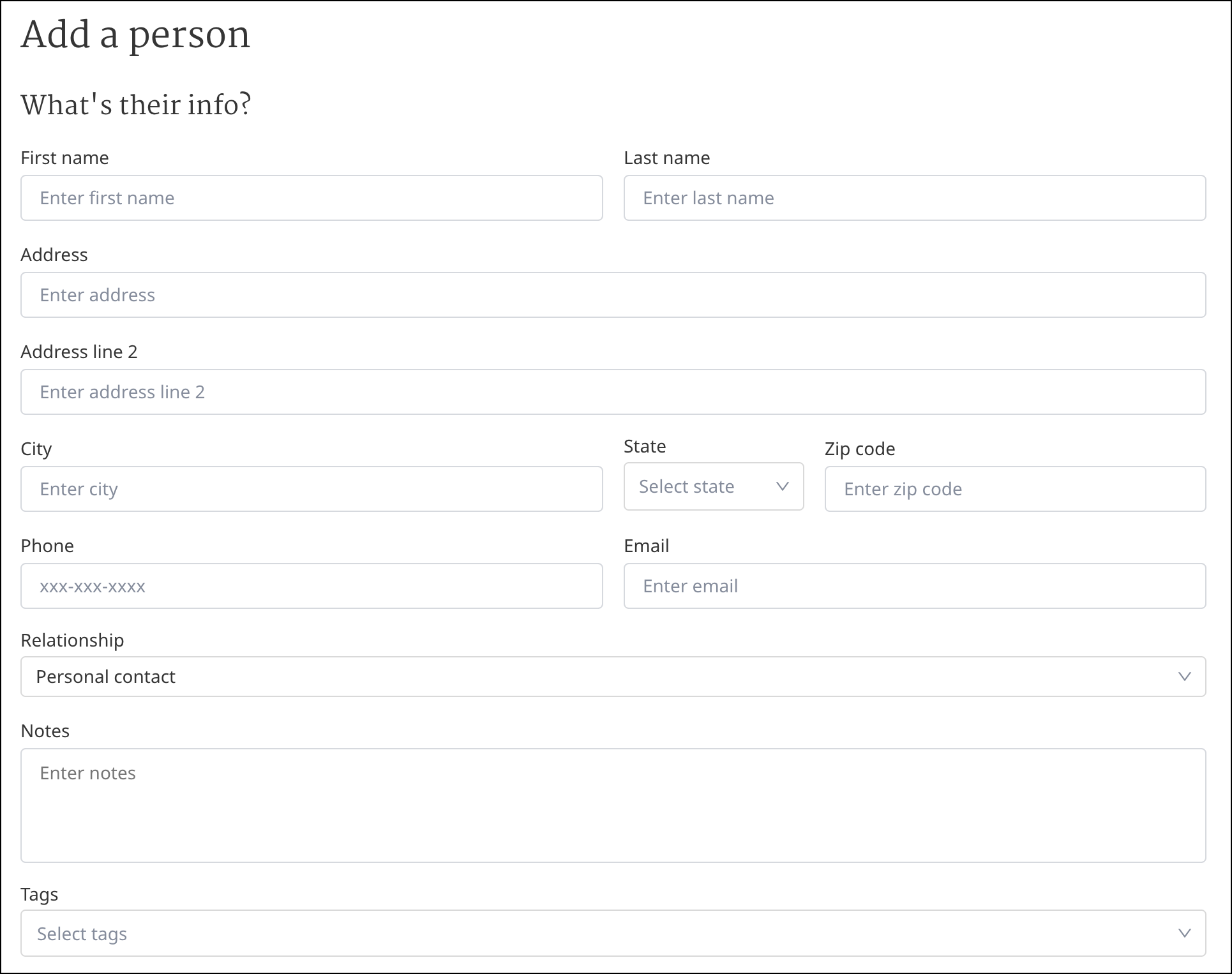Enter information for the person that you would like to add as a volunteer. While the only required field is the name, adding an email address or a phone number will allow the volunteer to create an account with Empower. You can also add notes or tags for this person.