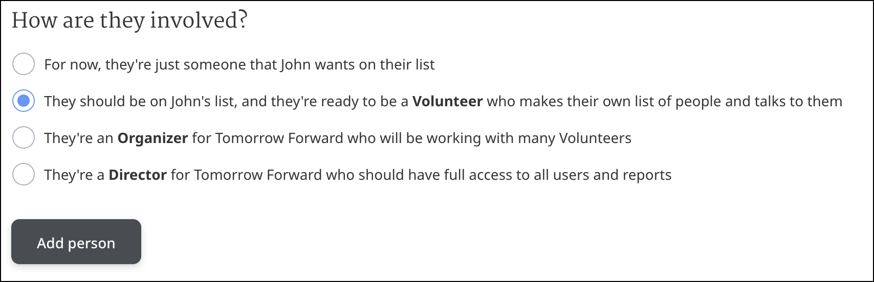Under the question How are they involved?, you can select: I want them on my list, and they're ready to be a Leader who makes their own list of people and talks to them. This option will make the person a volunteer.