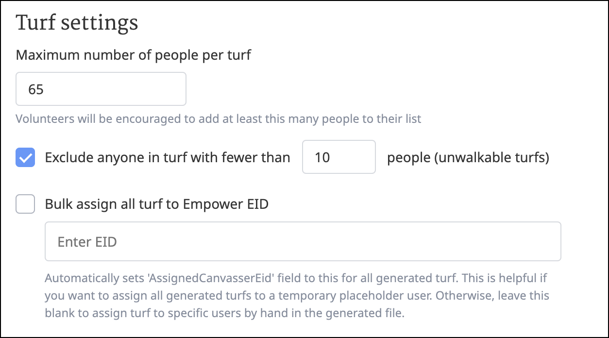 Choosing the maximum number of people per turf group. This number must be 10 or greater. This is the maximum number of addresses that will be included in each section of turf. While the maximum number of people per turf group is set at 65, you can adjust this. Empower works best with turfs that contain less than 200 people, so don't put a maximum above 200.