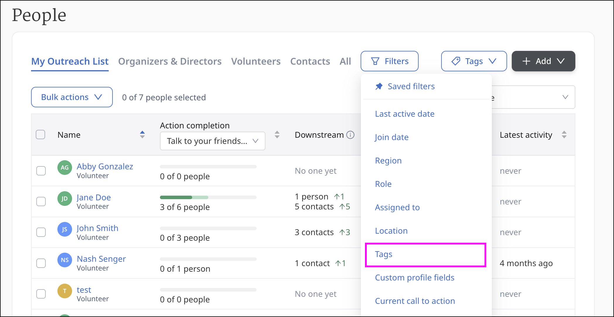 Find and click on the Filter button. Select Tags. You will be able to see the different turf tags that were assigned to contacts. These turf tags signify the turf that each contact is connected to. Select the tags for the turfs where you would like to reassign contacts from.