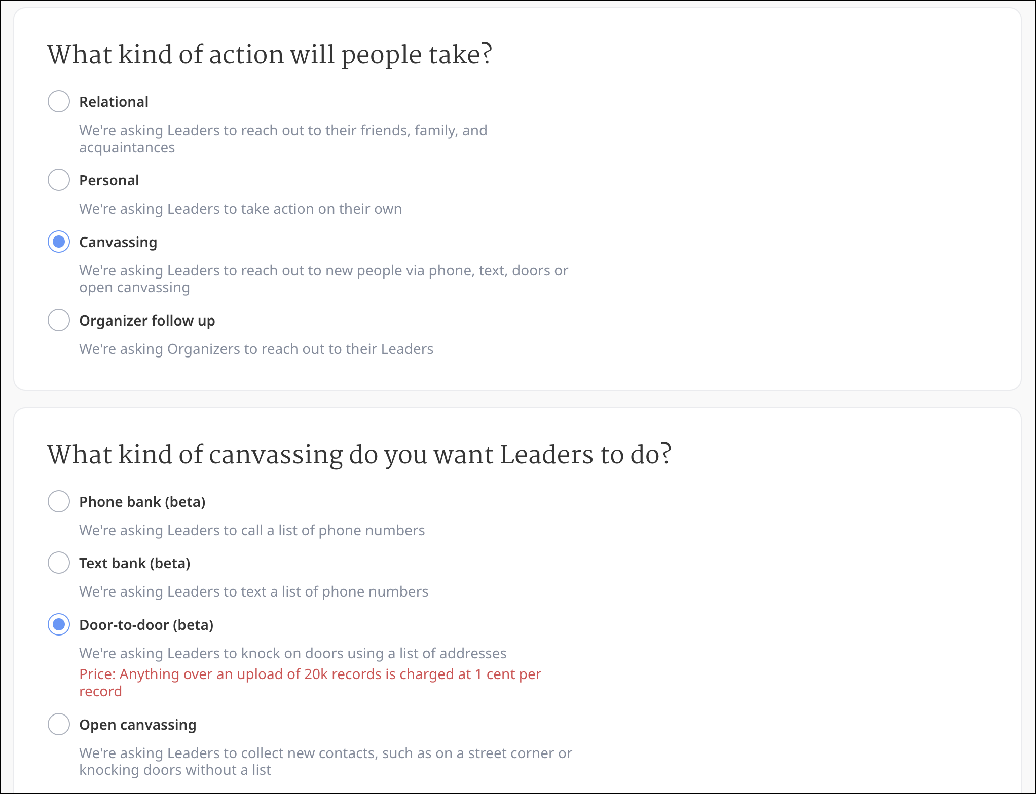 This article will walk you through creating and managing an Open Canvassing Call to Action. Open Canvassing Calls to Action ask volunteers to create more contacts to grow your relational network. Open Canvassing Call to Actions can be great ways to ...