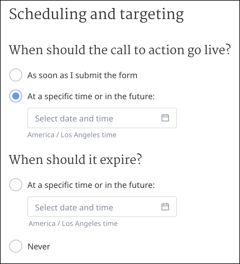 You can either select for the Door-to-Door Call to Action to go live immediately (select As soon as I submit the form) or you can pick a time for it to go live (select At a specific time in the future). You can also enter a time for the Door-to-Door Call to Action to end (select a date and time in the box under When should it expire?).