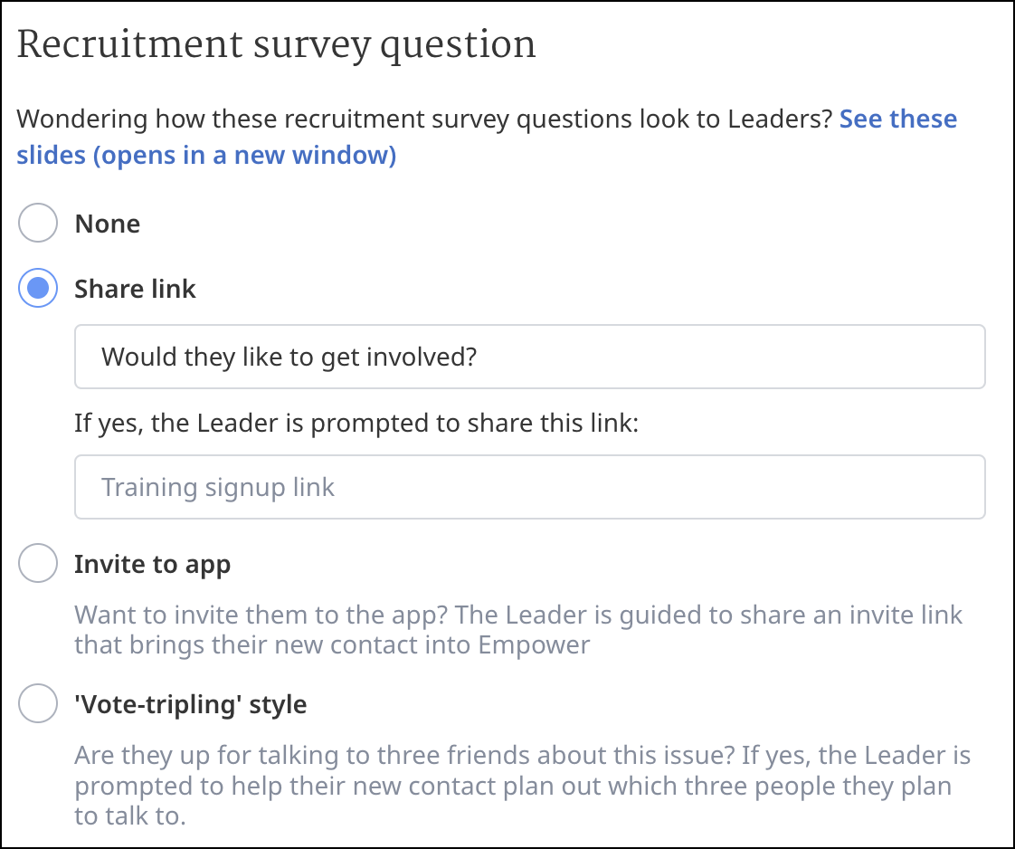 Below Recruitment Survey Question, you can add specific survey questions that volunteers will see in the Empower app. These specific survey questions include: invite to a training, invite to the app, and ‘vote-tripling’ style. If you would not like to use one of these types of survey questions, you can also select None. You can preview what the volunteers will see by clicking on the See these slides link.
