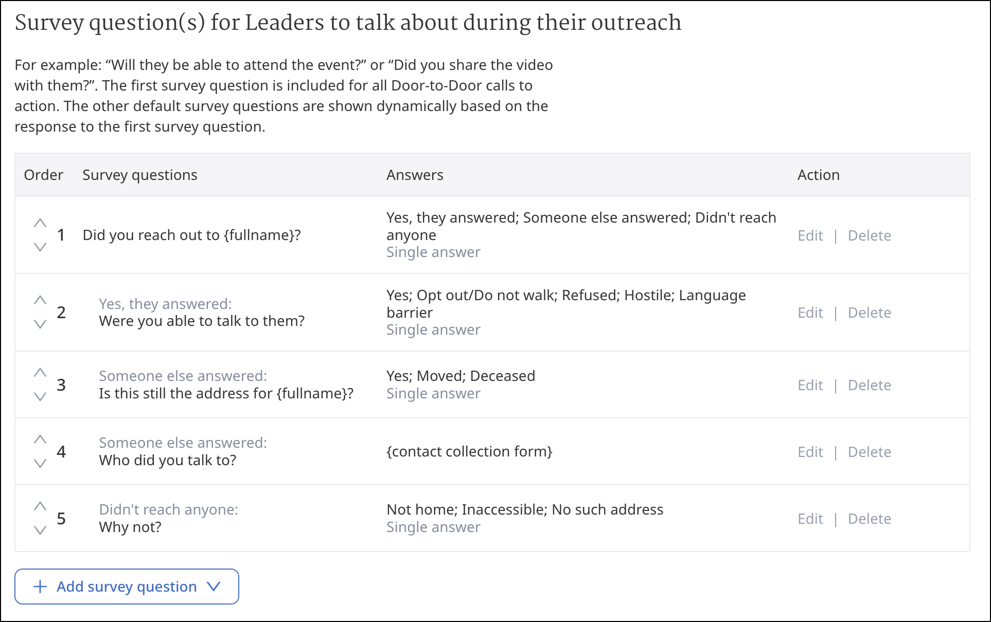 Under the Volunteers for Leaders to talk about during their outreach, you can add questions for volunteers to ask contacts. By default, Volunteers will see survey questions that allow them to select dispositions, which sync to VAN.