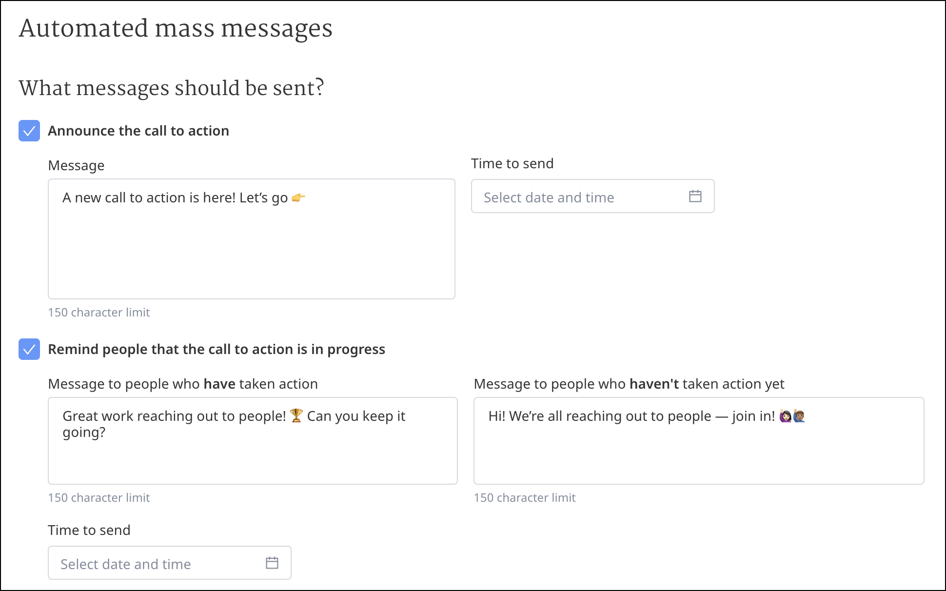 You can add reminders for the calls to action. Check the Remind people that the call to action is in progress box. You can add messages for volunteers who have taken the action (in the box next to Message to people who have taken action) and volunteers who haven’t taken the action (Message to people who haven’t taken action yet). These can be important nudges to either thank someone for taking action or to encourage your volunteers who are still waiting to take action. You can select a time for these reminders to go out in the Time to send box.