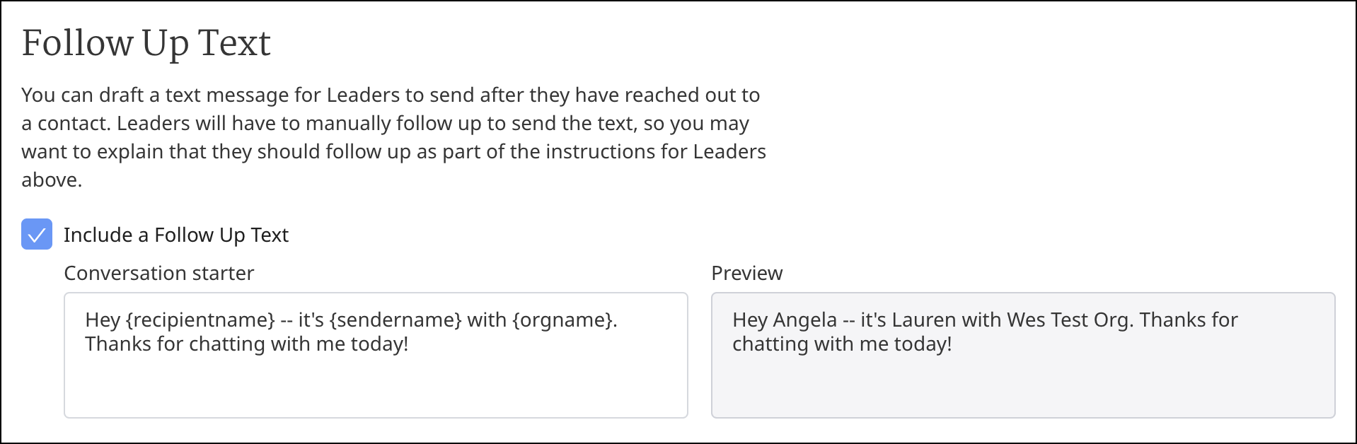 Under Follow Up Text, you can enter a text for volunteers to send to contacts that they meet during the Door-to-Door Call to Action. Volunteers will have to manually follow up to send the text, so you may want to explain that they should follow up as part of the instructions to volunteers above. This text can be the follow up text that volunteers send to a contact when they haven’t been able to reach them at the door. Also, you can add links or information that volunteers can share with contacts that they meet while door-to-door canvassing (e.g. a link to register to vote). You can embed the recipient or sender's name or EID in the message using {recipientname} {sendername} {recipienteid} or {sendereid} in the message and that placeholder will be filled with the correct information when the text message is generated. If you do not want to include a follow-up text to these new contacts, uncheck the Include a Follow Up Text box - although we recommend making one for door to door canvassing!