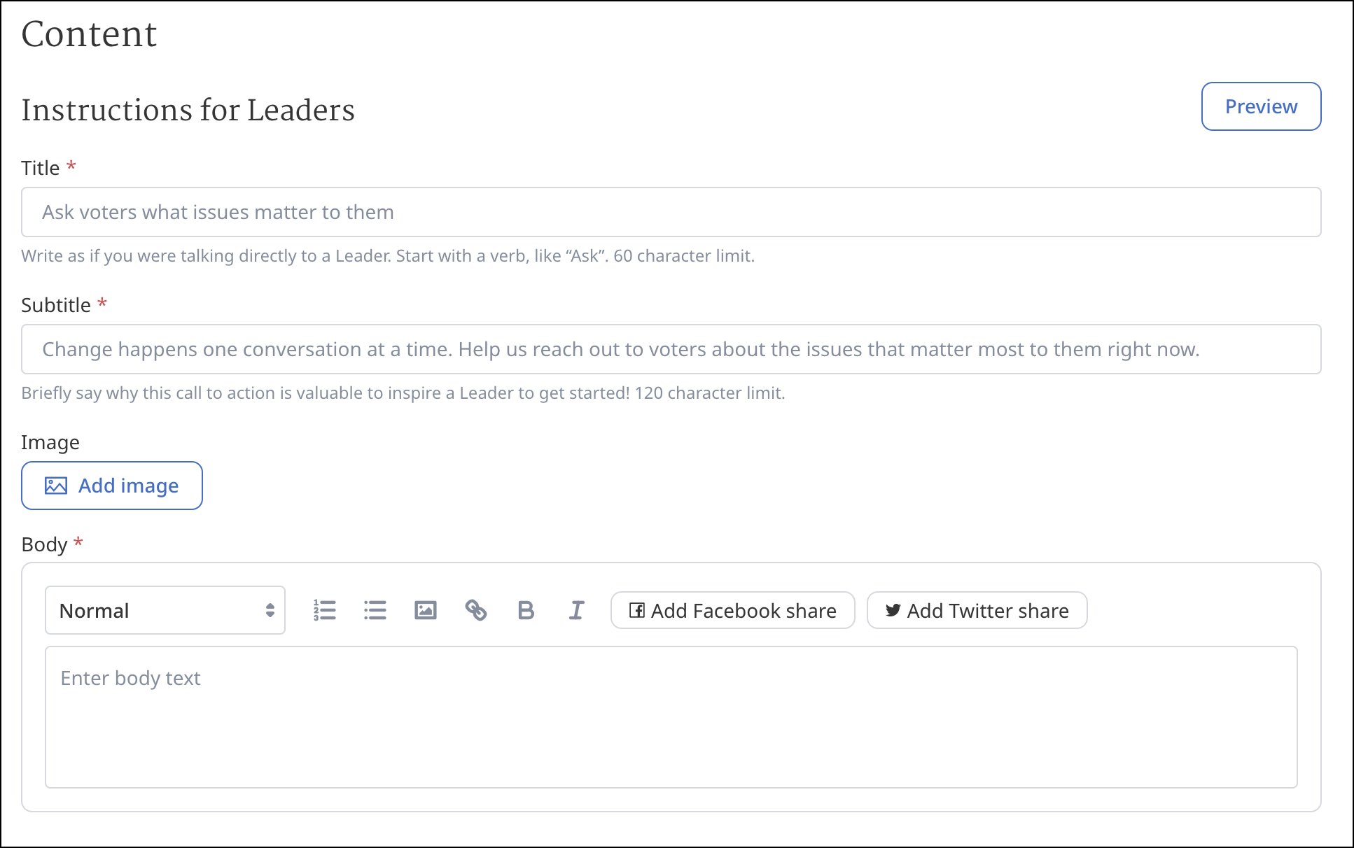 Provide additional information for your volunteers in the body section. You can provide some additional context and information for your volunteers in this section - such as a script, talking points and canvassing guide (tip: It’s important to make sure that your volunteers know what they can and can’t do on the doors! For example, volunteers should be friendly, but volunteers should not leave literature in mail boxes).