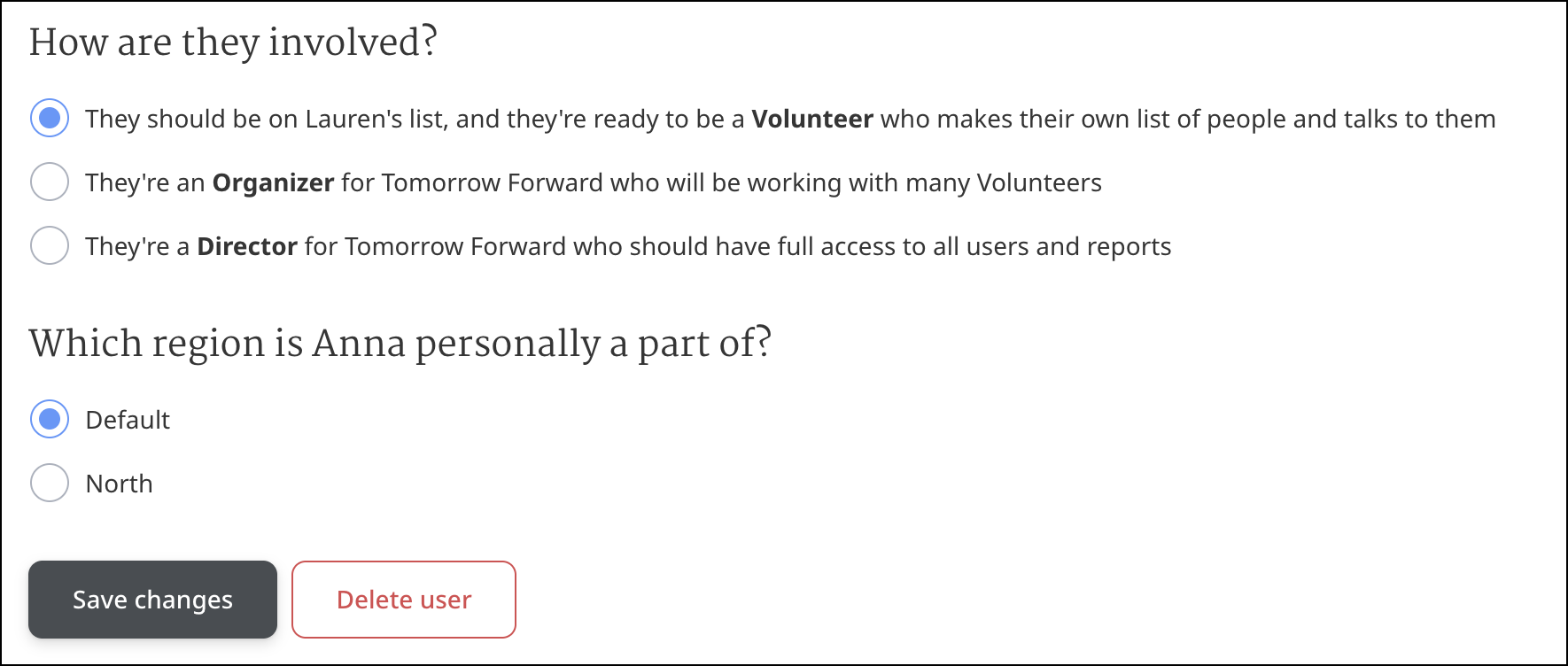 On this page, you can update the person’s identifying information. You can also change the list they are assigned to (under Whose list should they be on) and the permission and access of their account (under How are they involved). Additionally, you can change this person’s region.