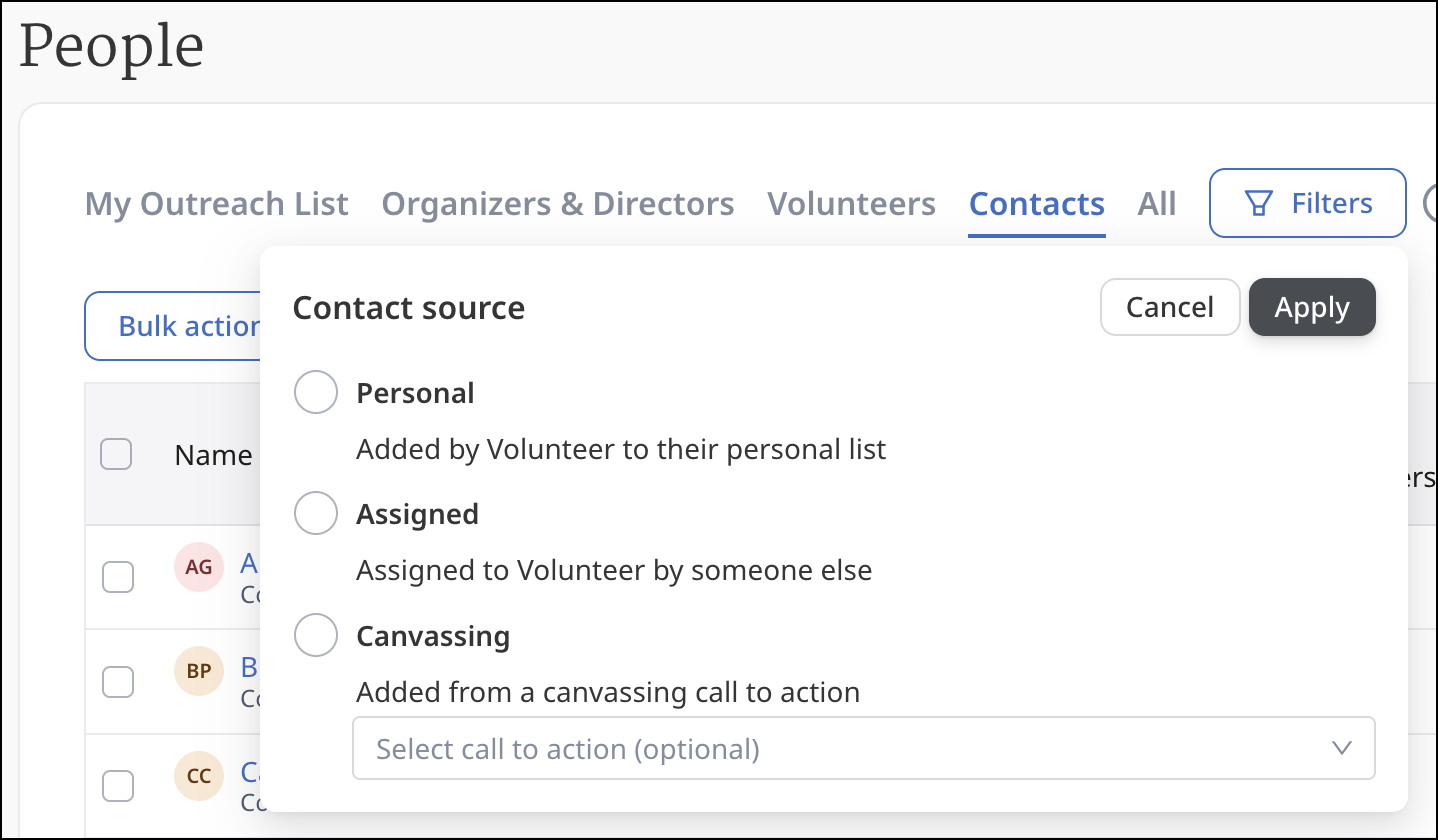 - The Contact Source filter will tell you how a contact was added. For example, you can tell if a contact was added by a Volunteer to their personal list, whether they were assigned to that Volunteer by someone else, or whether they were added from an Open Canvassing Call to Action. This can also help you determine whether a contact should be reassigned or deleted.