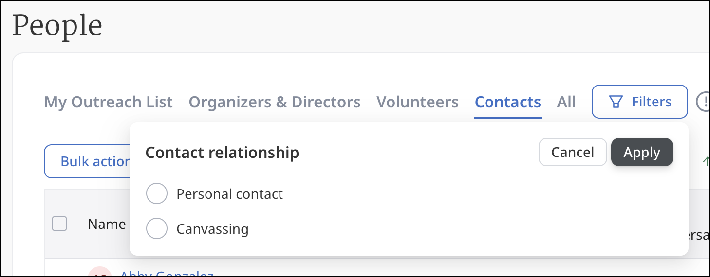 - Contact Relationship will tell you whether the Relationship field is set to Canvassing or Personal contact. You can use this before doing any bulk reassignment or deletion to be sure you don’t accidentally reassign or delete someone’s friends and family.