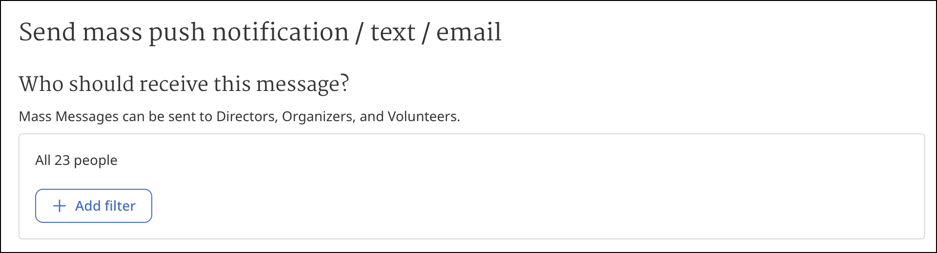 First, use filters to specify who should receive the mass message. This will be prefilled for you if you navigated here from the Send mass message buttons on the All People page or the Calls to Action page. Mass messages can only be sent to Volunteers, Organizers, and Directors. Contacts will never receive mass messages, even if they match the filters you set here.