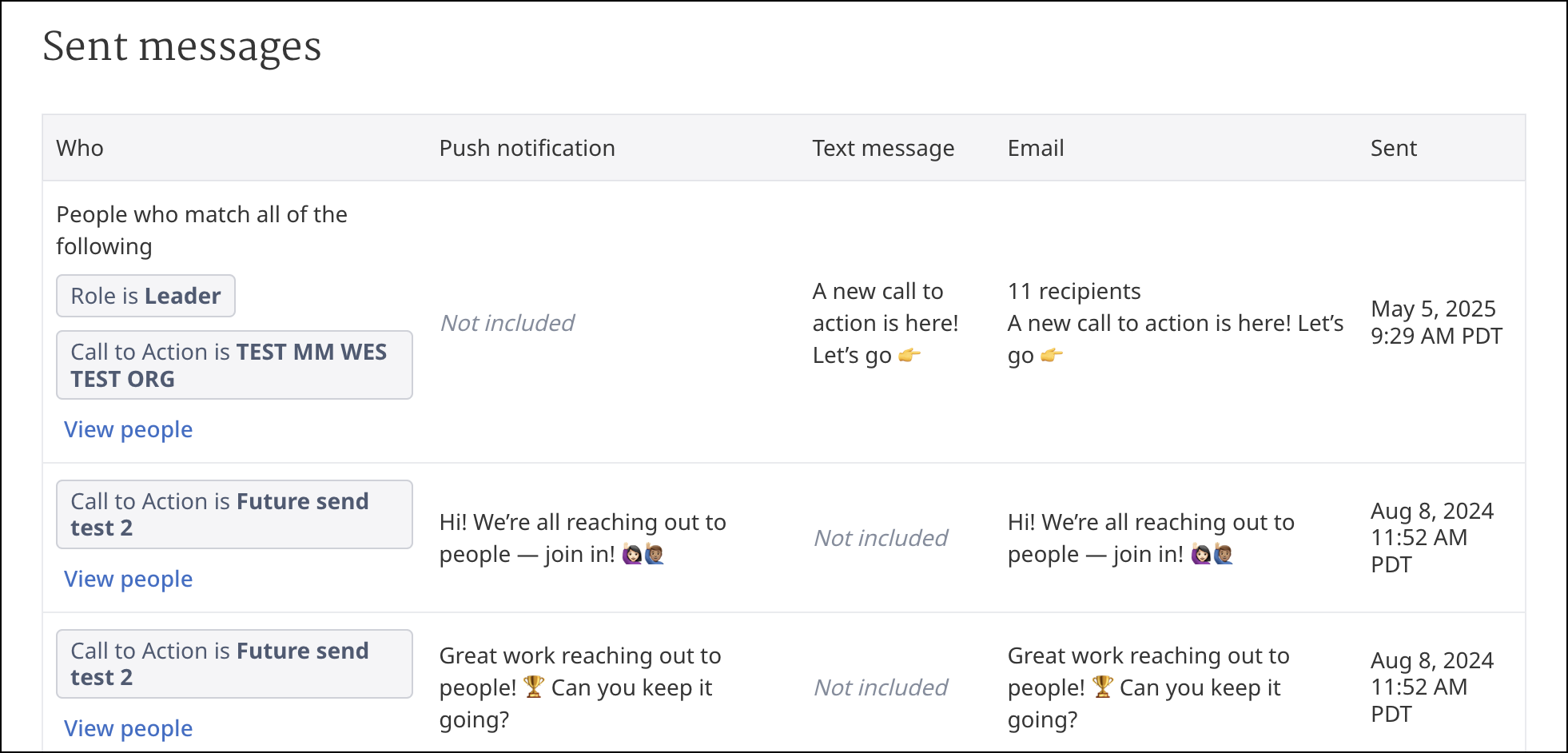 In your Empower Web App, navigate to Calls to Action tab or Organization tab and click on the Mass Messages button. If you would like to send mass messages about a particular Call to Action, you can also go to the Calls to Action page and select Actions and then Send mass message. You can also get to the mass messages screen by selecting some filters on the All People page and then going to Bulk Actions then Send mass message to send mass messages to people with the currently selected filters. Note that mass message targeting does not take the checkbox selections on the All People page into account, so you must select all people with the selected filters to send mass messages from the All People page.
