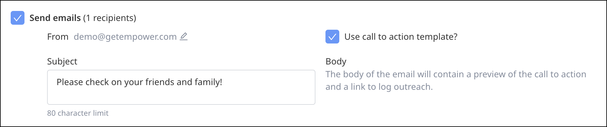 - If the Current Call to Action filter is used to target mass messages based on a particular Call to Action, the body of the email will contain a preview of the Call to Action and a link to log the outreach. This will make it super easy for the Volunteer to complete and log the outreach. Otherwise, you will need to write the body of the email as well.