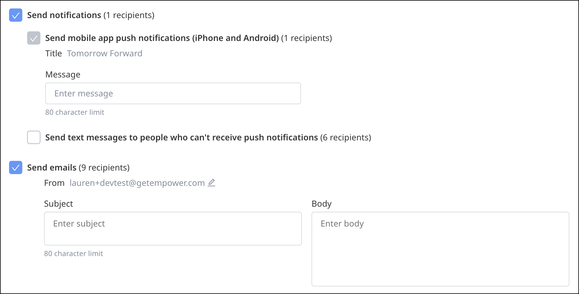- Next, you will have to choose the type of mass message that you send. You can select between just sending a notification on the Empower App, sending a notification on the Empower App and texting individuals who don’t receive push notification on the App, and sending emails.