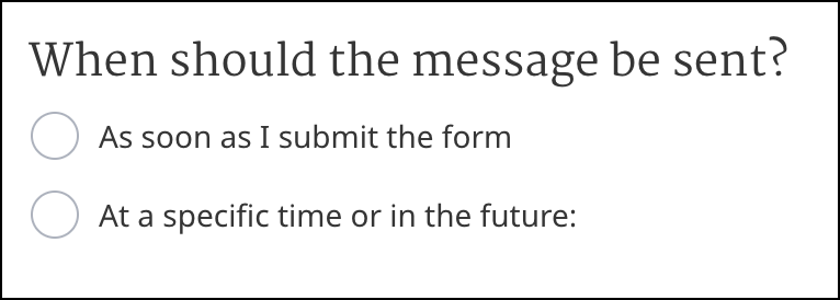 - Next, choose when to send the mass message. Messages for a specific time in the future will be scheduled and sent at the time you select. Filters will be applied at the time the messages are sent. If you want to send the same mass message multiple times, you can press the + button to add additional times when the same message will be sent.