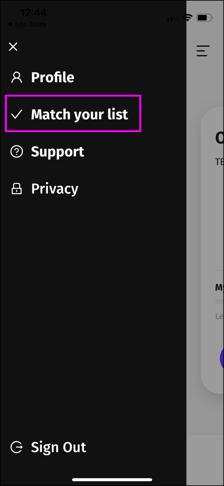 Click the settings button with the three parallel lines on the upper left hand corner of the screen then click Match your list. Volunteers can find this view by navigating to the People tab and then selecting Match list.