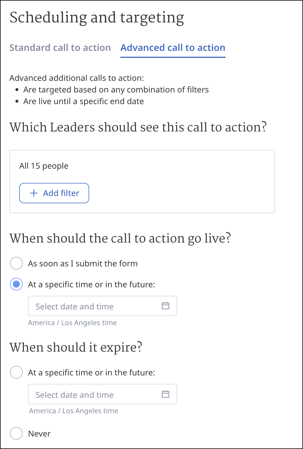 For an Advanced Additional Call to Action, you can apply filters to create a more targeted group to assign your Call to Action. You can choose whether to have the Call to Action go live immediately, or set a specific time and date for the Call to Action to go live. Additionally, you can set a date and time for when the Call to Action will expire.