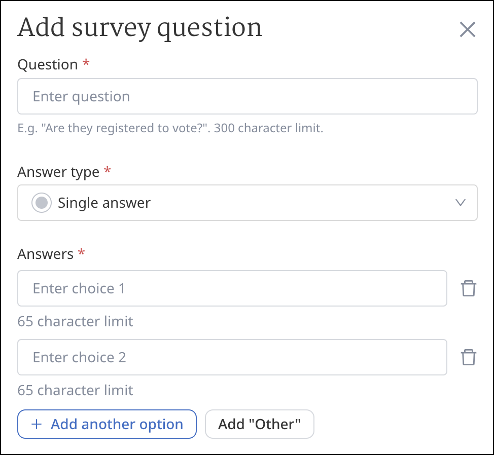 For the answer type, you can choose either a Single answer or Multiple answers. Select Single answer when you are only looking for one answer to the question. Select Multiple answers when there can be more than one answer to the question that your volunteers are posing.
