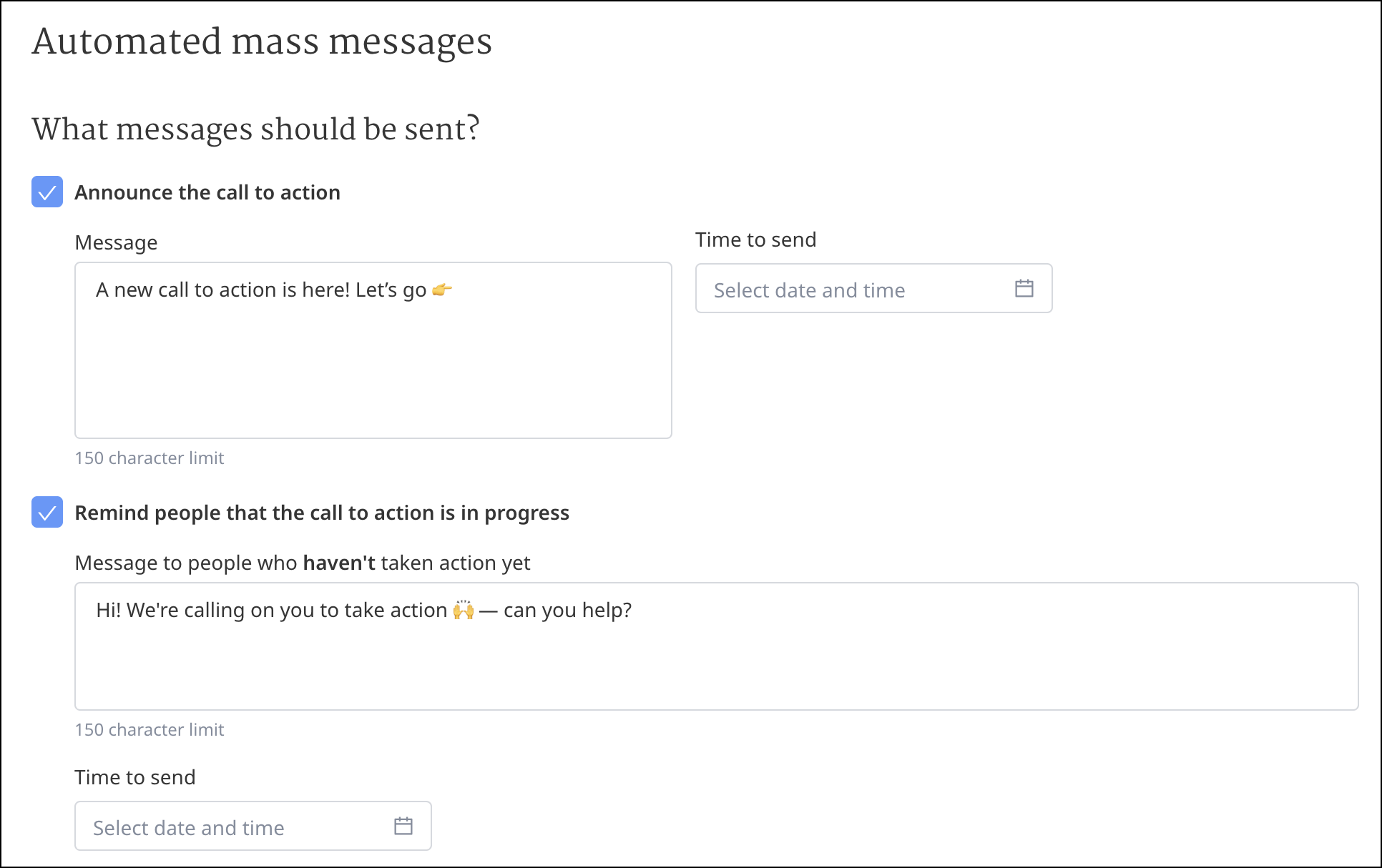 You can add reminders for the calls to action. Check the Remind people that the call to action is in progress box. You can add messages for volunteers who have taken the action (in the box next to Message to people who have taken action) and volunteers who haven’t taken the action (Message to people who haven’t taken action yet). These can be important nudges to either thank someone for taking action or to encourage your volunteers who are still waiting to take action. You can select a time for these reminders to go out in the Time to send box.