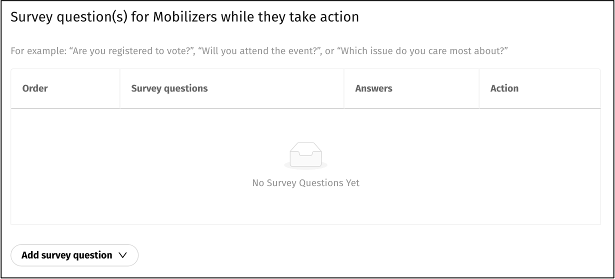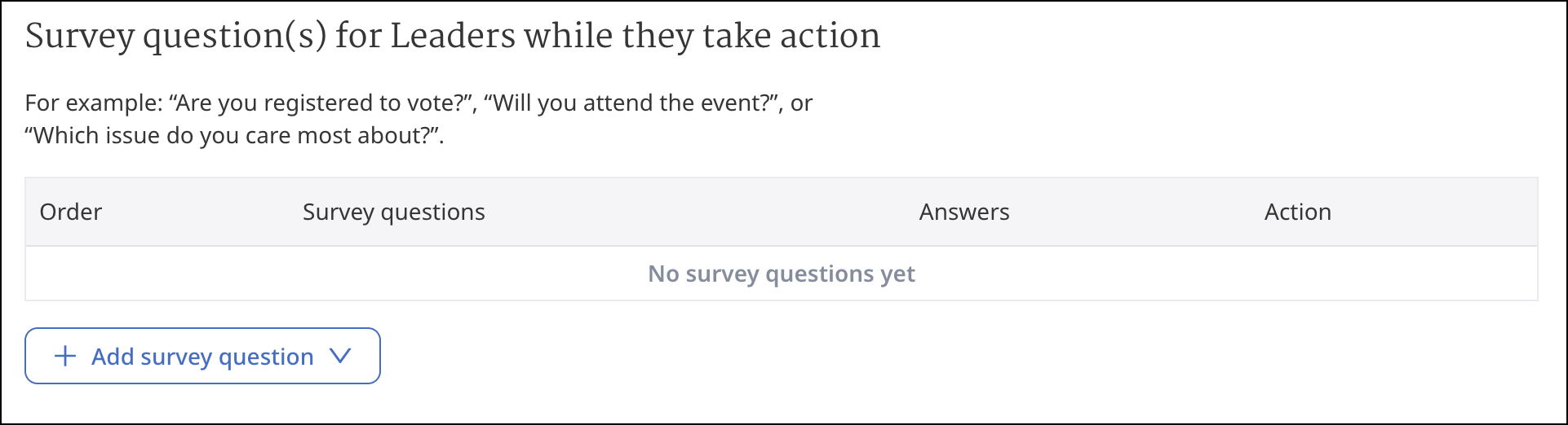 Under theSurvey Question(s) for Volunteers to talk about while they take action, you can add questions to guide volunteers as they take action.