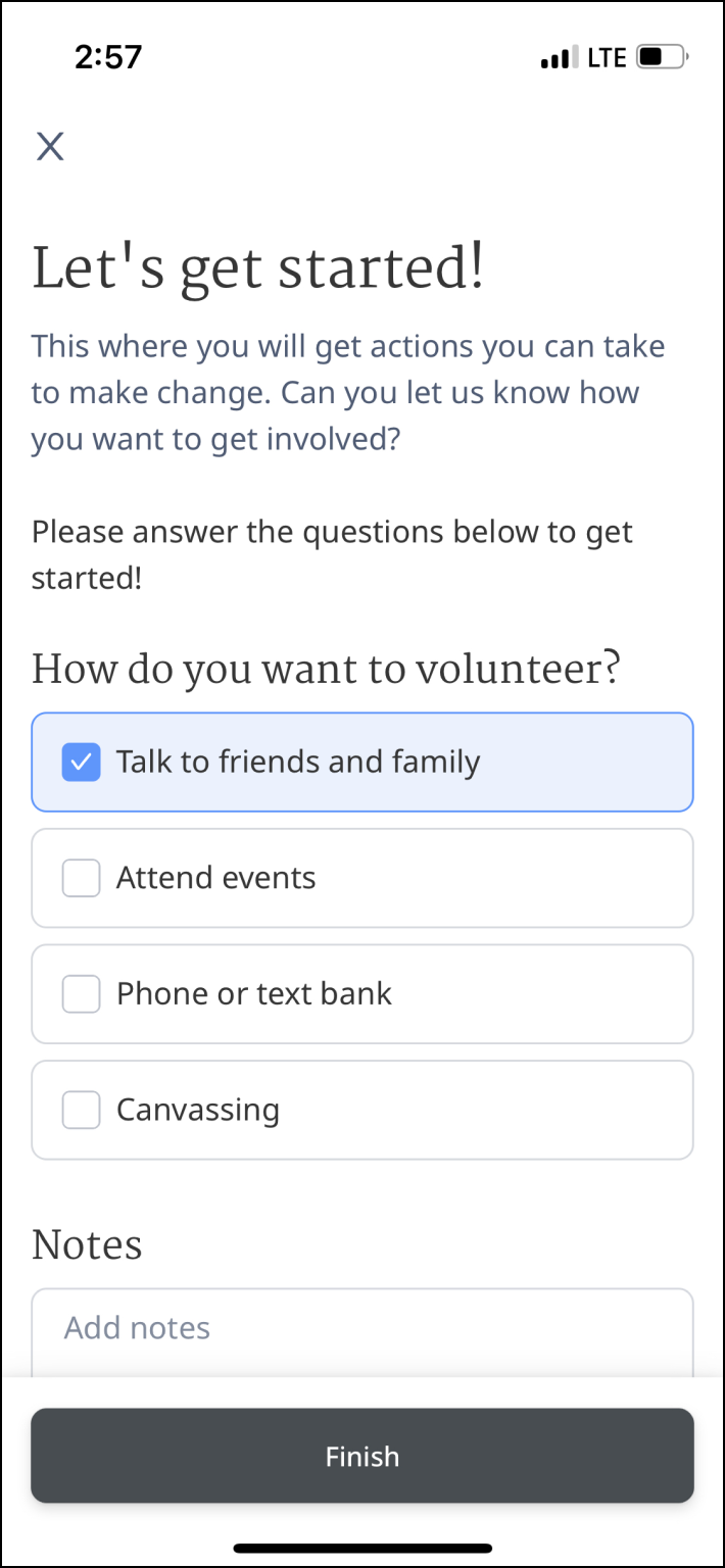 After all of the survey questions, you will see a notes box where you can add any additional information or notes that might be helpful as you are responding to the Personal Call to Action. Click Finish to submit the Personal Call to Action.