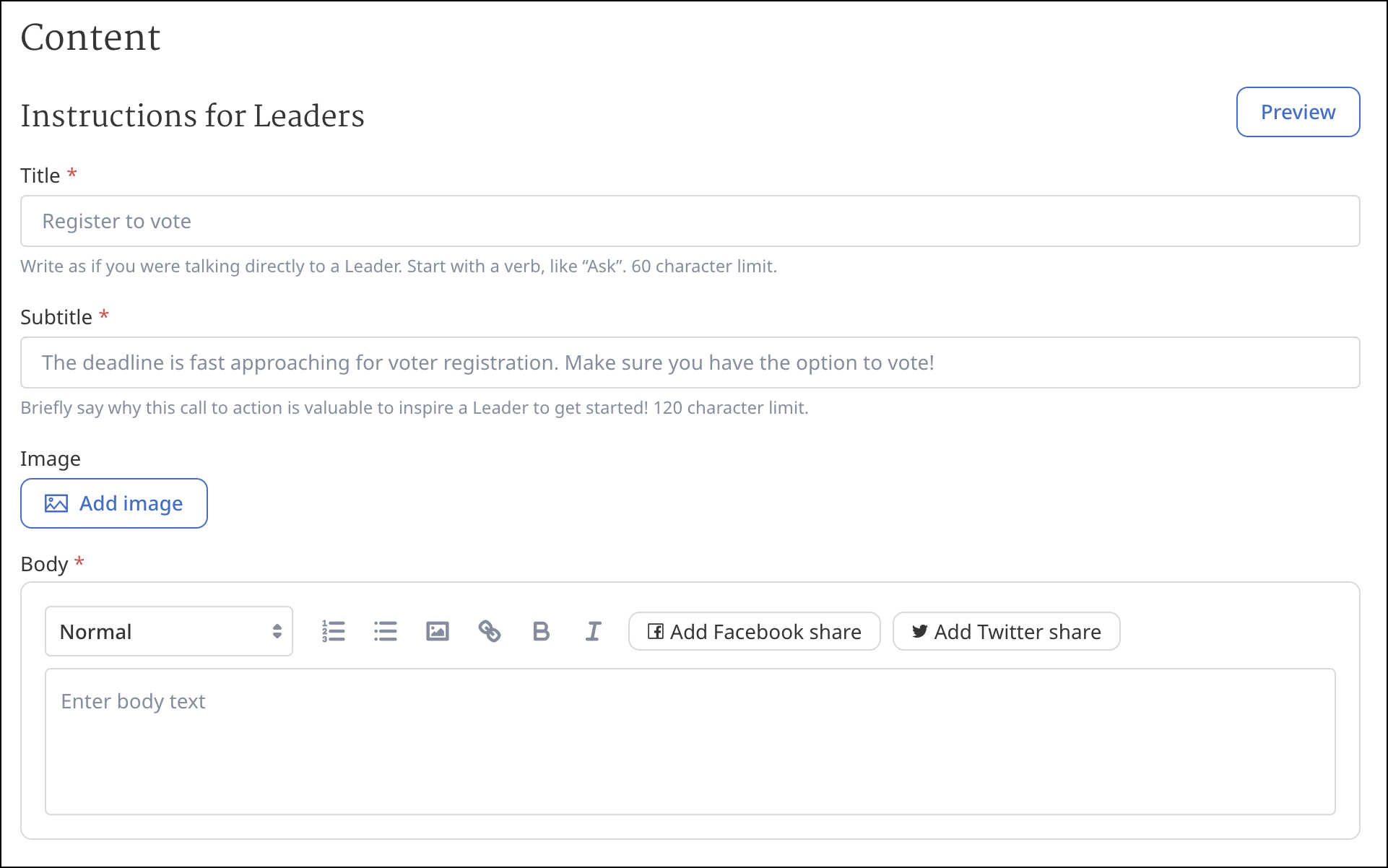 Provide additional information for your volunteers in the body section to help them get started with the call to action. The body section should be in depth so volunteers know what they are doing. (tip: engaging CTA’s use bolded text when appropriate, bullet points and even graphics!). It's helpful to provide some additional detail in a Personal Call to Action. Volunteers will be asked to take actions themselves, so they might need some additional direction.
