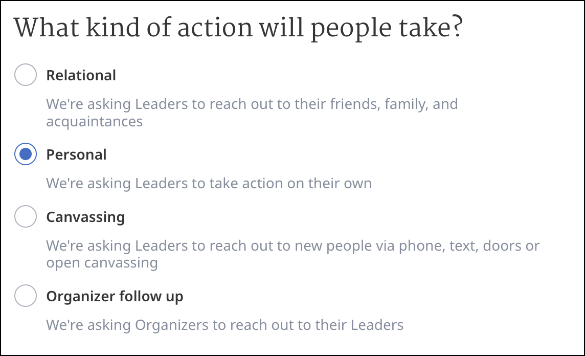 This article will walk you through creating Personal Calls to Action. Personal Calls to Action allow volunteers to read the call to action and then take action themselves. Personal Calls to Action are an excellent way to position volunteers to take an action and further engage them with your organizing campaign.